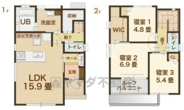 LDK15.9畳(1F)、洋6.9畳(2F)、洋5.4畳(2F)、洋4.8畳(2F) |