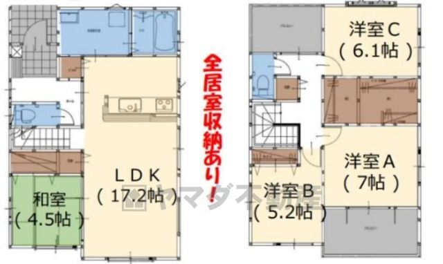 LDK17.2畳(1F)、和4.5畳(1F)、洋7畳(2F)、洋6.1畳(2F)、洋5.2畳(2F) |