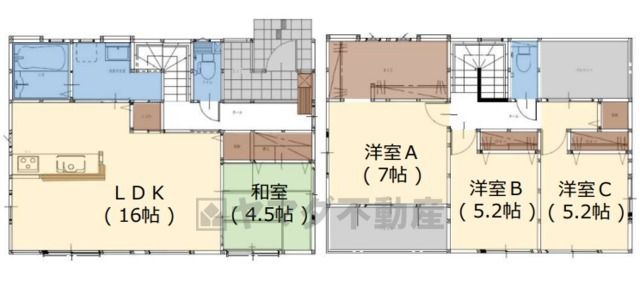 LDK16畳(1F)、和4.5畳(1F)、洋7畳(2F)、洋5.2畳(2F) |