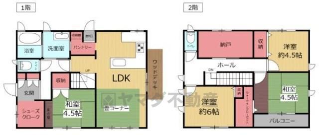 LDK13.7畳(1F)、和4.5畳(1F)、洋6畳(2F)、洋4.5畳(2F)、和4.5畳(2F) |