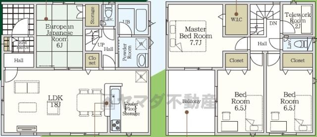 LDK18畳(1F)、和6畳(1F)、洋7.7畳(2F)、洋6.5畳(2F) |
