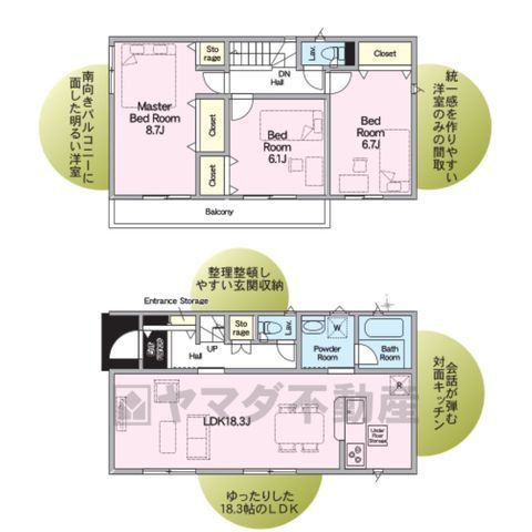 LDK18.3畳(1F)、洋8.7畳(2F)、洋6.7畳(2F)、洋6.1畳(2F) |
