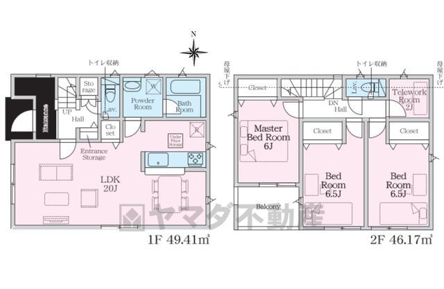 LDK20畳(1F)、洋6.5畳(2F)、洋6畳(2F) |