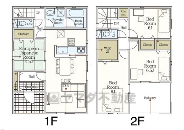 LDK16畳(1F)、和4.5畳(1F)、洋8畳(2F)、洋6.5畳(2F)、洋6畳(2F) |
