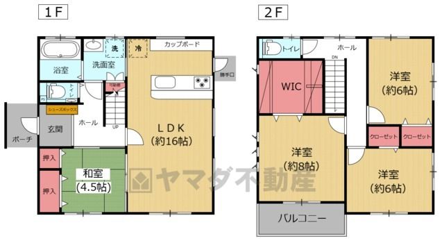 LDK16畳(1F)、和4.5畳(1F)、洋8畳(2F)、洋6畳(2F)、S3.7畳(2F) |