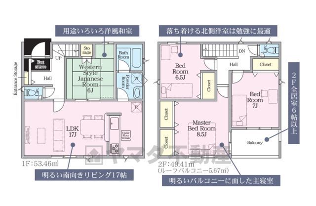 LDK17畳(1F)、和6畳(1F)、洋8.5畳(2F)、洋7畳(2F)、洋6.5畳(2F) |
