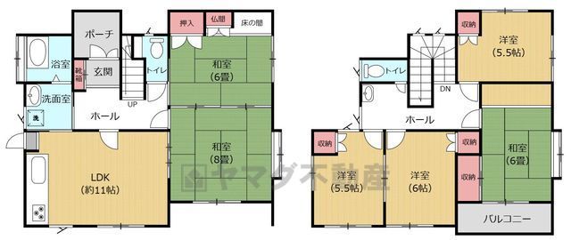 LDK11畳(1F)、和8畳(1F)、和6畳(1F)、和6畳(2F)、洋6畳(2F)、洋5.5畳(2F) |