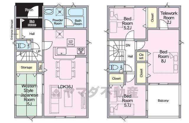 LDK16畳(1F)、和5畳(1F)、洋8畳(2F)、洋5.7畳(2F)、洋5.2畳(2F) |