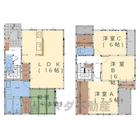 LDK16畳(1F)、和4.5畳(1F)、洋7.5畳(2F)、洋6畳(2F) |