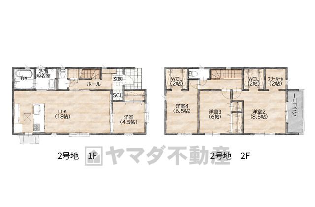 LDK18畳(1F)、洋4.5畳(1F)、洋8.5畳(2F)、洋6.5畳(2F)、洋6畳(2F) |
