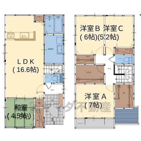 LDK16.6畳(1F)、和4.5畳(1F)、洋7畳(2F)、洋6畳(2F)、洋5.2畳(2F) |