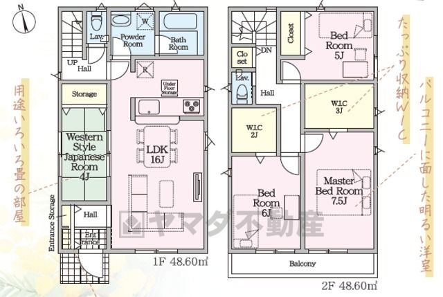 LDK16畳(1F)、和4畳(1F)、洋7.5畳(2F)、洋6畳(2F)、洋5畳(2F) |