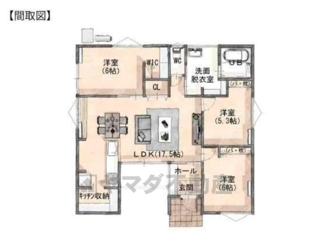 LDK17.5畳(1F)、洋6畳(1F)、洋5.3畳(1F) |