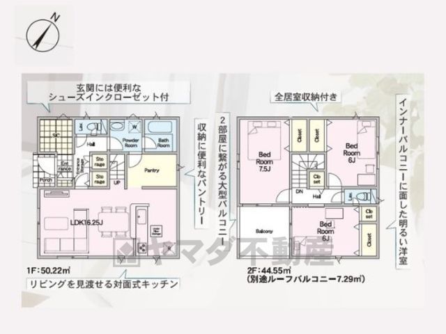 LDK16.2畳(1F)、洋7.5畳(2F)、洋6畳(2F) |