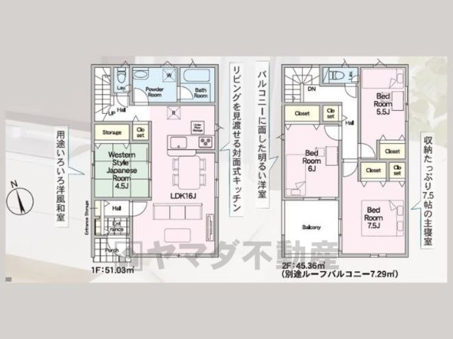 | 間取り詳細 | LDK16畳(1F)、和4.5畳(1F)、洋7.5畳(2F)、洋6畳(2F)、洋5.5畳(2F) | 都市計画 | 市街化区域 |