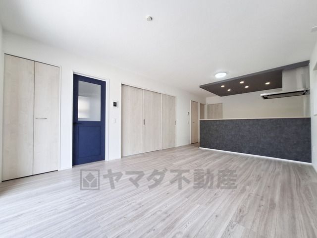 ナチュラルな色合いのフローリングが明るく広々とした空間を演出しています。キッチンとのつながりもスムーズなレイアウトです。収納扉やアクセントになる青いドアがポイントになっています。