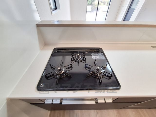 三口のガスコンロが設置されており調理スペースがしっかりと確保されています。清潔感のあるキッチンでお手入れも簡単です。作業動線を考えた配置が魅力的です。