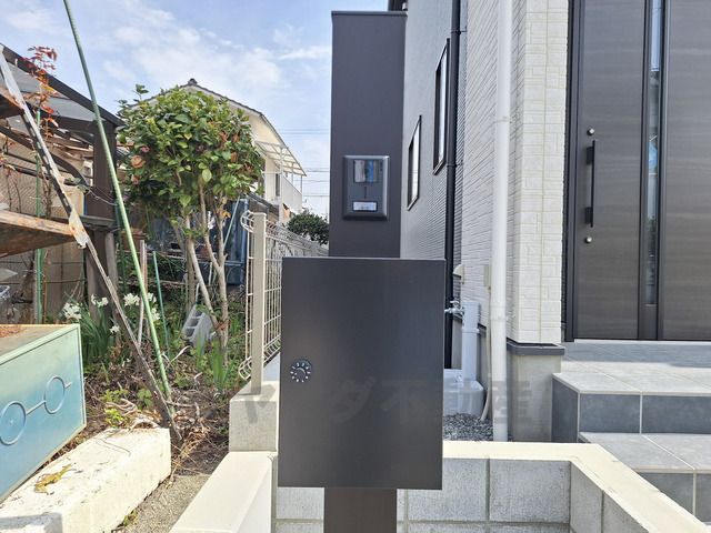宅配ボックスとインターホンが設置されています。シンプルなブラックのデザインが建物と調和しています。玄関周りもすっきりとした印象です。
