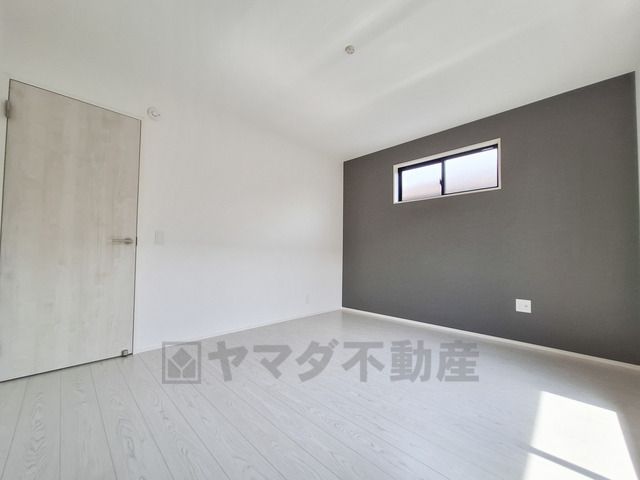 大きな窓から光が差し込む明るく開放感のある洋室です。壁の一部がアクセントカラーになっておりシンプルなデザインが魅力です。