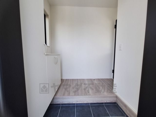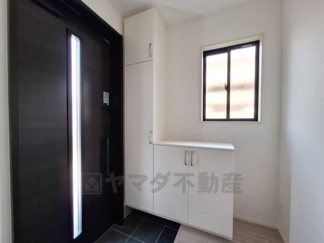 シンプルで清潔感のある玄関です。明るい採光窓があり心地よい光が差し込みます。収納スペースも確保されています。ダークカラーのドアが空間を引き締めます。