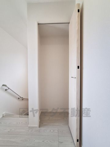 シンプルなデザインの収納スペースです。明るい色合いの内装が空間をすっきりと見せています。階段近くに位置しているので使い勝手にも配慮されています。扉付きで見た目も整っています。
