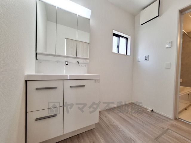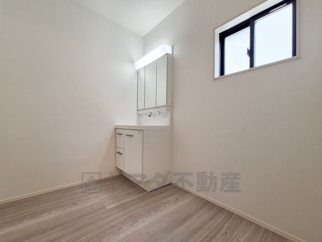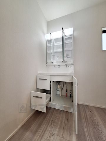 洗面台・洗面所はシンプルで使いやすいデザインが魅力です。明るい照明と清潔感のある空間が広がっています。収納スペースもすっきりとまとまっています。窓からの採光で自然な明るさが感じられます。