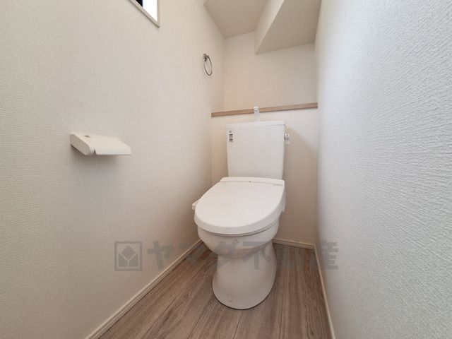 清潔感のあるトイレ空間です。シンプルなデザインで落ち着いた印象を与えます。壁や床も明るい色合いで開放的な雰囲気が感じられます。ペーパーホルダーやタオル掛けが使いやすい位置に配置されています。