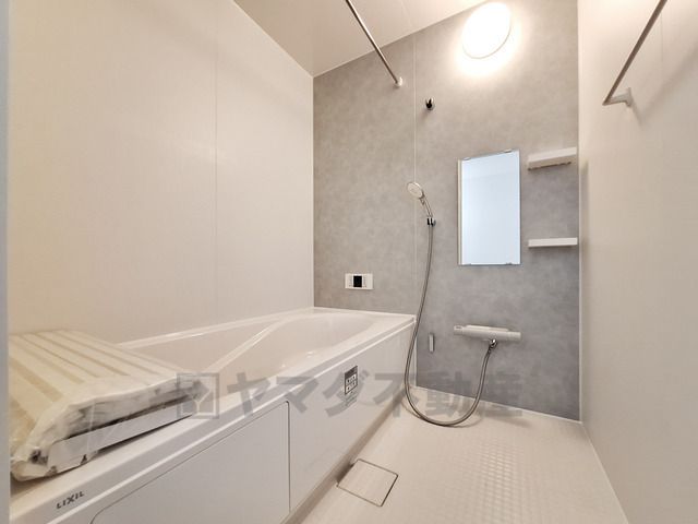 明るく清潔感のあるバスルームです。浴槽はゆったりとした造りでリラックスできる空間です。壁面には収納棚や鏡があり使い勝手が良い仕様です。浴室乾燥機用の物干しパイプも備えられています。