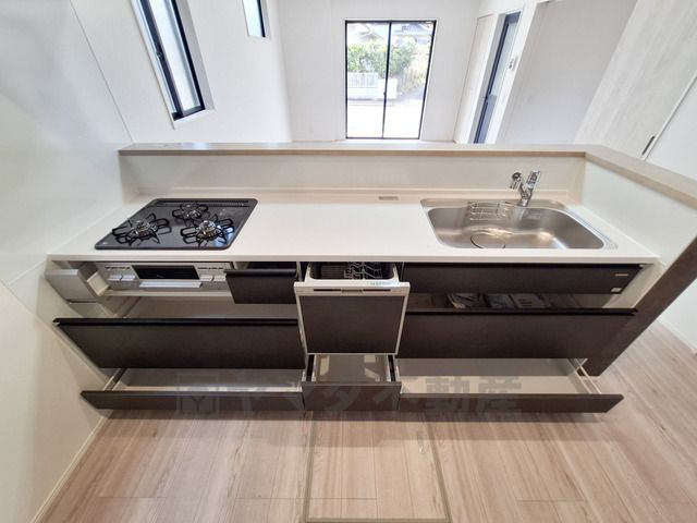 シンプルなデザインのキッチンです。直線的なレイアウトで作業スペースが広めに確保されています。収納が豊富で引き出しも使いやすく設計です。窓が多く明るさが感じられる空間です。